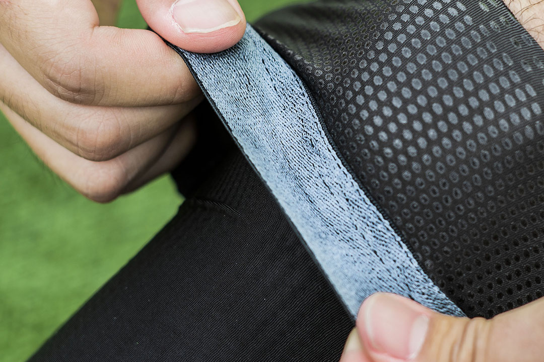 プレーをし始めてまず感じたのは、ひざが守られている感覚があること。これは関節の動きを立体的に捉えた“3D動態解析技術”によるものです。ひざを曲げ伸ばしした際の皮膚の伸長率を分析して、生地の伸長率を調節しているのですが、その秘密は内側の樹脂プリントにあるようです。よく見るとドットのプリント密度が場所によって異なり、伸長率を調節することで、ひざの動きにうまく追随する設計なんだそう。