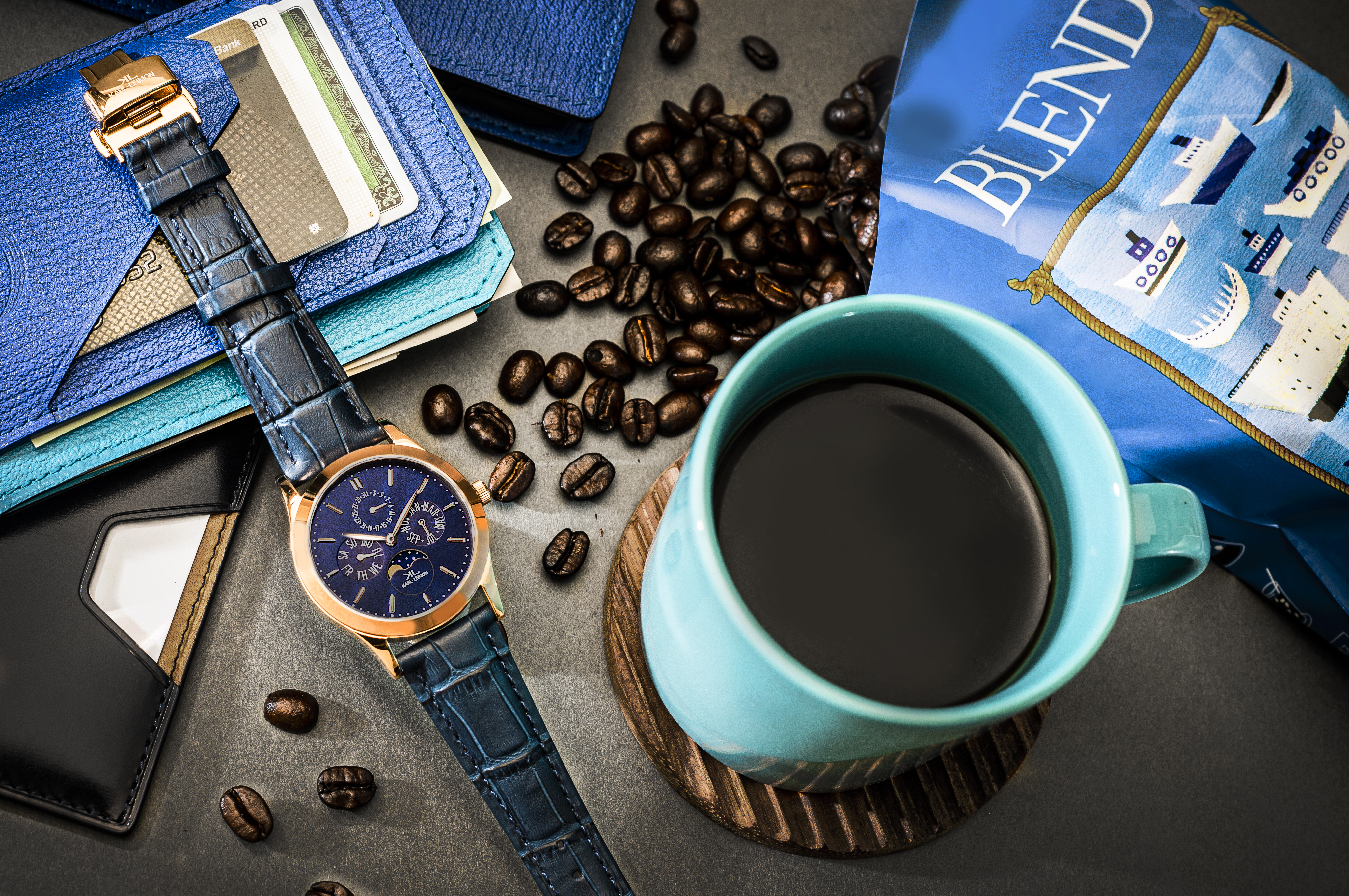 このクラシカルな雰囲気がスーツスタイルを格上げしてくれるから、今までは尻込みしていた高級レストランや老舗の喫茶店なんかにも入る自信がついた。仕事がうまくいっているのも、青色コーデが好きになったのも、すべてこの腕時計のおかげだね!