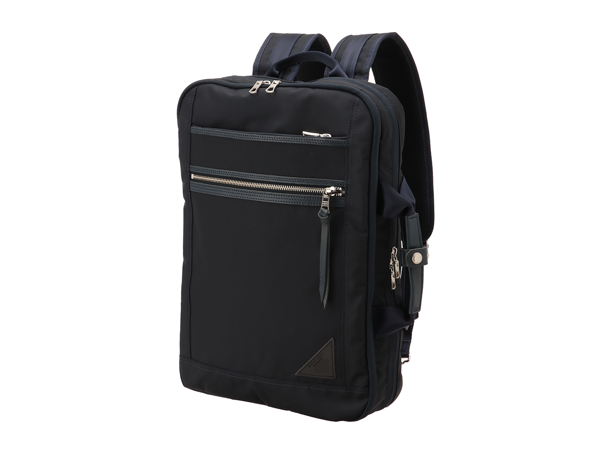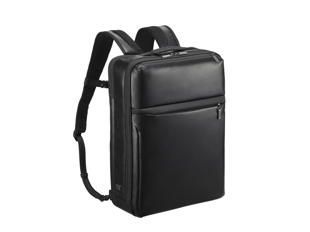 荷物の出し入れがしやすい、2気室のバックパック。B4サイズのファイルや15インチのノートパソコンも収納でき、ビジネスシーンで活躍します。側面ファスナーとメイン気室からアクセス可能な2Wayポケットは、内側に吸水速乾メッシュが採用されており、雨具や飲み物の収納に便利。背面はメッシュ素材のクッションパッドで通気性がよく、背負い心地も抜群です。