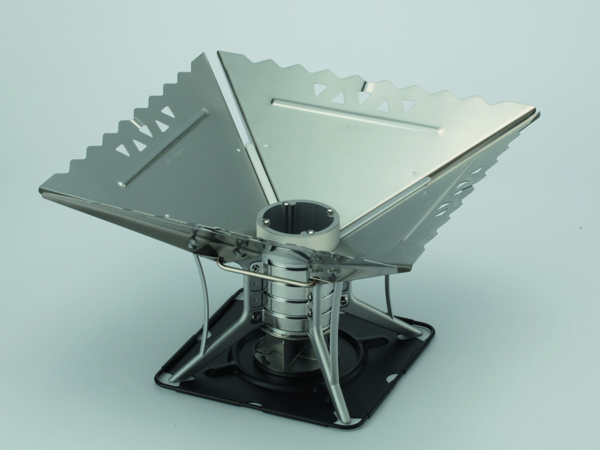 薪への着火を容易にする、近未来的な焚火台。筒の中に、小枝などの燃えやすいものを火種として投入して着火。フィンキャップが横風を筒内に取り込み、種火が安定して燃えるようアシストします。筒上部をフィンキャップでフタをすれば、炭火でも利用できます。ベースは小さく折り畳め、ウィングも1枚ずつ取り外せるため、持ち運びにも便利です。