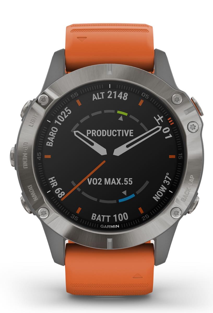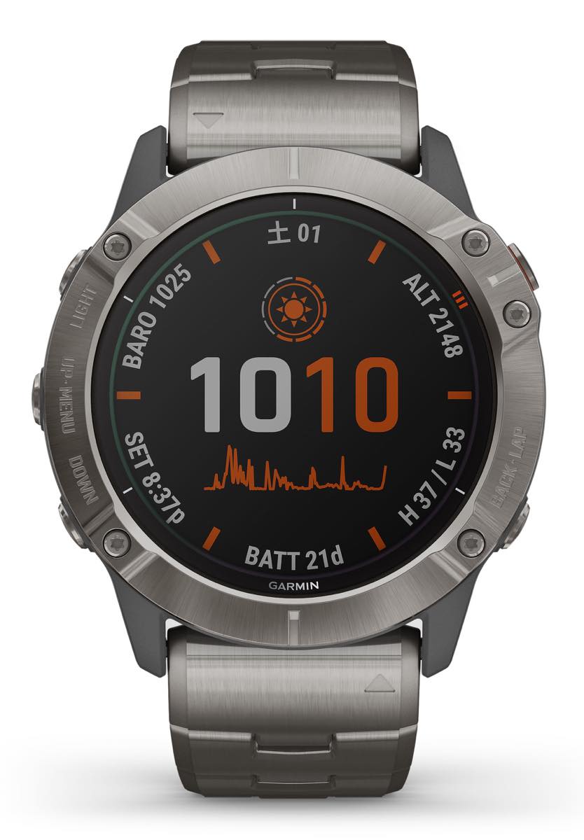 直径47mmのケースに1.3インチの大型ディスプレイ、サファイアクリスタル風防。国土地理院の地形図データや日本国内の詳細な道路地図データ、音楽再生機能も搭載する、「fēnix 6シリーズ」のスタンダードモデル。チタンベゼル+ポリマーケース、シリコンストラップ、72g。チタンブレスレットなどモデルバリエーションも豊富。