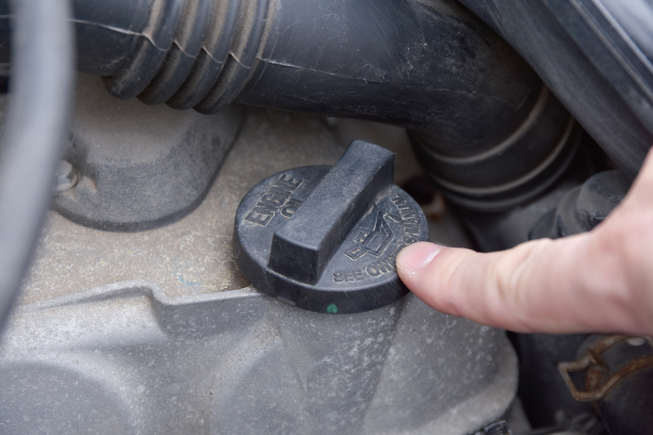 ▲ボンネットを開けて、キャップに描かれたマークを確認してから作業すること。入れるのはオイル注入口。絶対に燃料タンクに入れないように注意しよう!