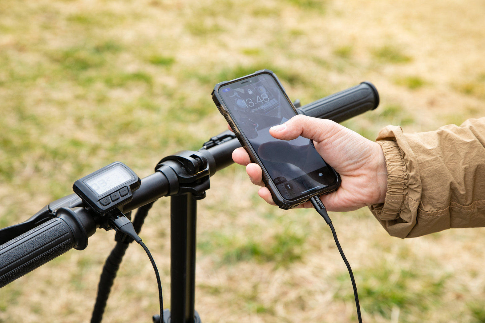 何を隠そうHold Onには、スマホを充電できるUSB電源ポートが搭載されているんだ。しかもハンドルに付いているディスプレイ部にポートがあるから、スマホを充電できるっていうわけ。これが本当に便利!