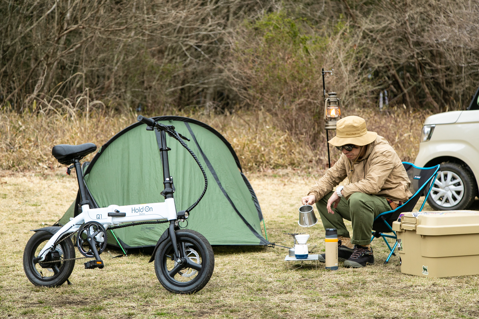 そして極めつけは、コンパクトなのに航続距離なんと最大100km! 一般的な電動アシスト自転車の約3倍移動できるんだ。だからバッテリー切れの心配をすることなく、気の向くままに思う存分サイクリングが楽しめる。トイレや水場に行くのも、Hold Onさえあればあっという間。デザインもイケてるから、なんだか他のキャンパーから見られている気がするな。