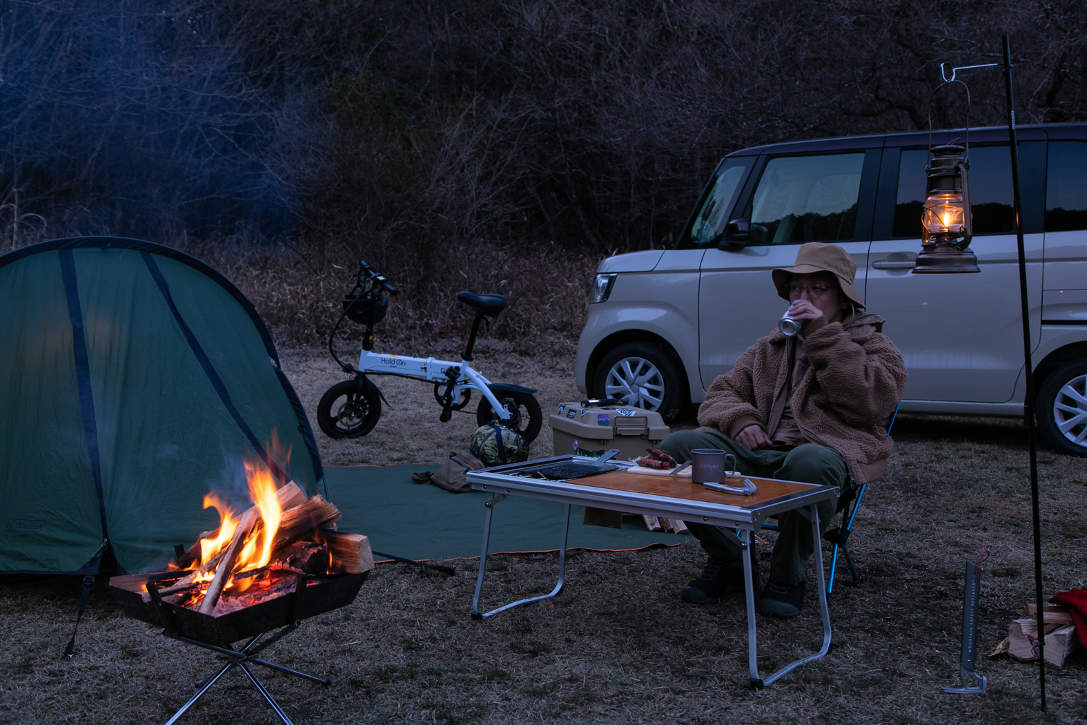 いい汗をかいたし、いい写真も撮れたし、そろそろ暗くなり始めたのでテントに戻って焚き火を始めよう。でも、かなり走ったにも関わらず疲れはそこまでじゃない。やっぱり電動アシスト自転車ってすごいなぁ。