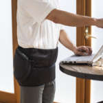 腰に巻く時は、まず上ベルトの端を持ち、足を閉じて、ベルトをおしりに当てます。おしりの下にヒップストッパー、体の中心にセンターガイドを合わせ、左右のベルトが同じ長さになるように調整。上のベルトから巻き、そのあとに下ベルトを体に沿うように巻けば完了です。