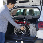 折り畳み自転車2台に、2人分のチェアと荷物が余裕で入るラゲッジスペースは見た目以上。しかもテールゲート下部は無塗装のバンパーで、荷物の出し入れでボディを傷をつける心配がない。遊び心と実用性を備えたデザインだ。