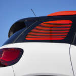 後方から眺めたときのアイキャッチとなるリアクオーターウインドウのグラフィックにも同色の挿し色。採光を得て室内を明るく開放的にするだけでなく、エクステリアのアクセントにもなっている。