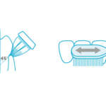 「バス法」は、歯ブラシの毛先を歯と歯ぐきの境目に当てて動かします。重要なのが、当てる角度と動かし方! 歯に対して斜め45°に歯ブラシの毛先を当て、歯周ポケットに毛先が入るようなイメージで、ヨコに細かく動かします。