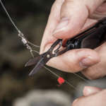 仕掛けをこまめに変えるようなときには、小型のハサミでスパッと切断。もちろんサビにくいので水辺でも安心して使えるし、思わぬ大物が釣れたら、その場でおおよその大きさを図ってメモしておくのも、ペン付きなのでお手の物。