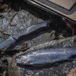 釣りを楽しむこと2時間、ビギナーズラックなのか、夕食には十分な量の魚が釣れました! 釣った魚はなるべく早く締めて鮮度をキープ。「レンジャーグリップ 55 オニキス ブラック」のラージブレードは刃長が10cmほどあるので、手を添えてトントン……というわけにはいきませんが、魚も肉も切りやすくて調理にもいい感じ。クレソンなどの野草が手に入ったら、細かく刻んでお腹に詰めてもいいかも。