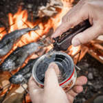 そして「レンジャーグリップ 55 オニキス ブラック」には缶切りもあるので、持ってきた缶詰を焚き火で温めておつまみに。缶を直火にかけると有害ともいわれるため、あくまで温める程度。焼くだけ、温めるだけという夕食は、決して“料理した”と胸を張って言えない稚拙なものですが、都会では味わえないとっておきの味で大満足!