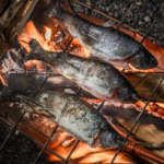 魚に串を刺し、じっくり焚き火であぶれば皮がぱりっと焼き上がります。焚き火の香りをまとった魚はこの上ないうまさ。なによりも自給自足な雰囲気を味わえるからたまりません。