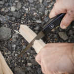 まずは周辺の木を拾ってきて跳ね上げ用のポールとペグを仕立てます。「レンジャーグリップ 55オニキス ブラック」はハンドルが長く、しっかり力を込められるから硬めの木を加工しやすいことに驚き。枝分かれを利用しようか、それとも枝を取り払ってなめらかにしようか……そんな風に考えながら作業を進めます。