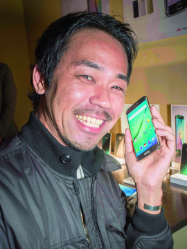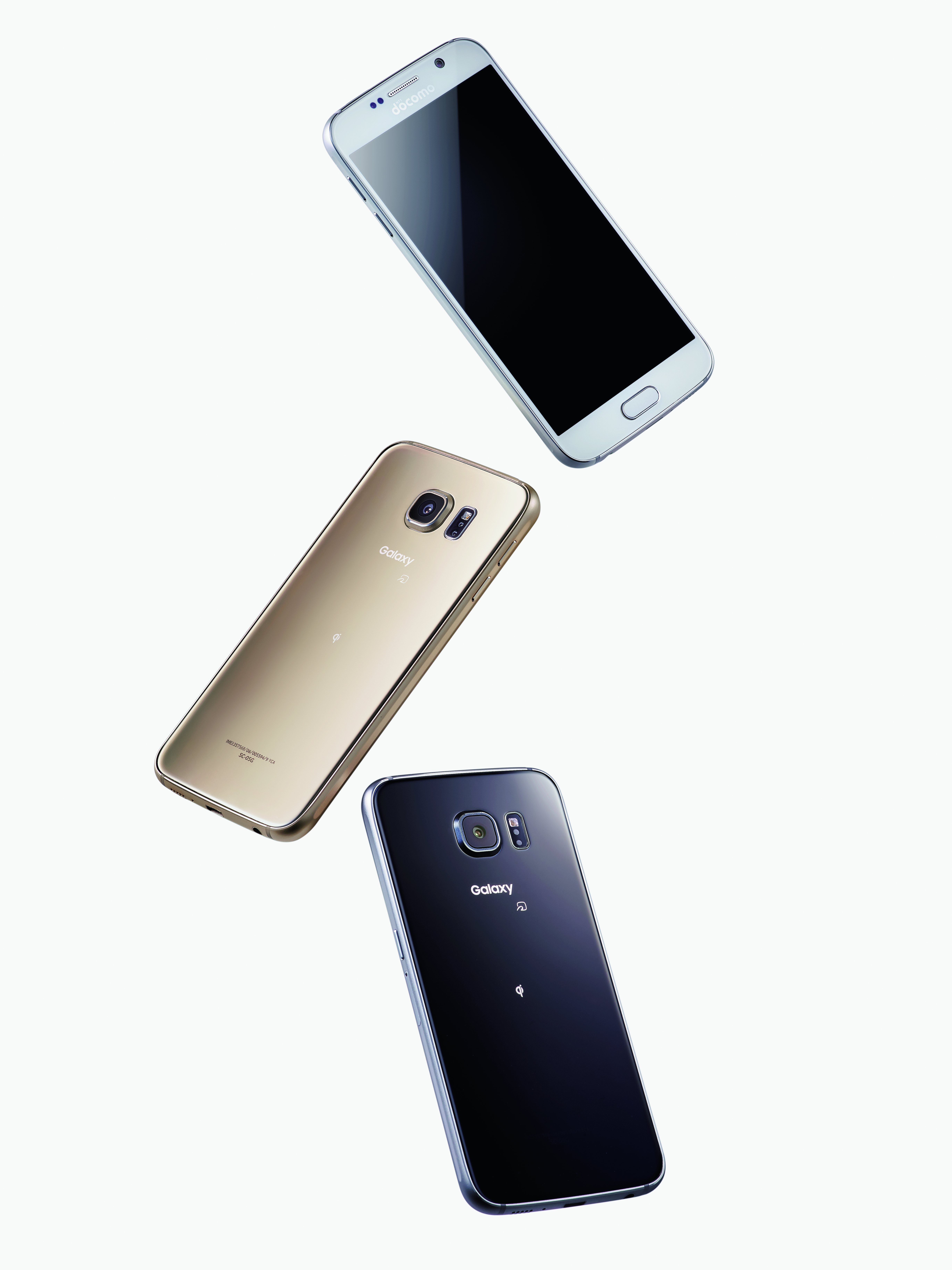 「Galaxy S6 edge」と併せて注目したいのが「Galaxy S6」。こちらはデュアルエッジスクリーンこそ採用されていないが、フロントと背面の仕上げや質感、そして機能やスペックはedgeと同様となっている。フラットデザインだが、端末の厚さはわずか6.8㎜で、握った時のホールド感は十分。しかも、ポケットなどにも収まりやすいスリムサイズを実現している。カラーはWhite Pearl(上)、Gold Platinum(中央)、 Black Sapphire(下)の3バリエーションで、こちらはNTTドコモより発売されている