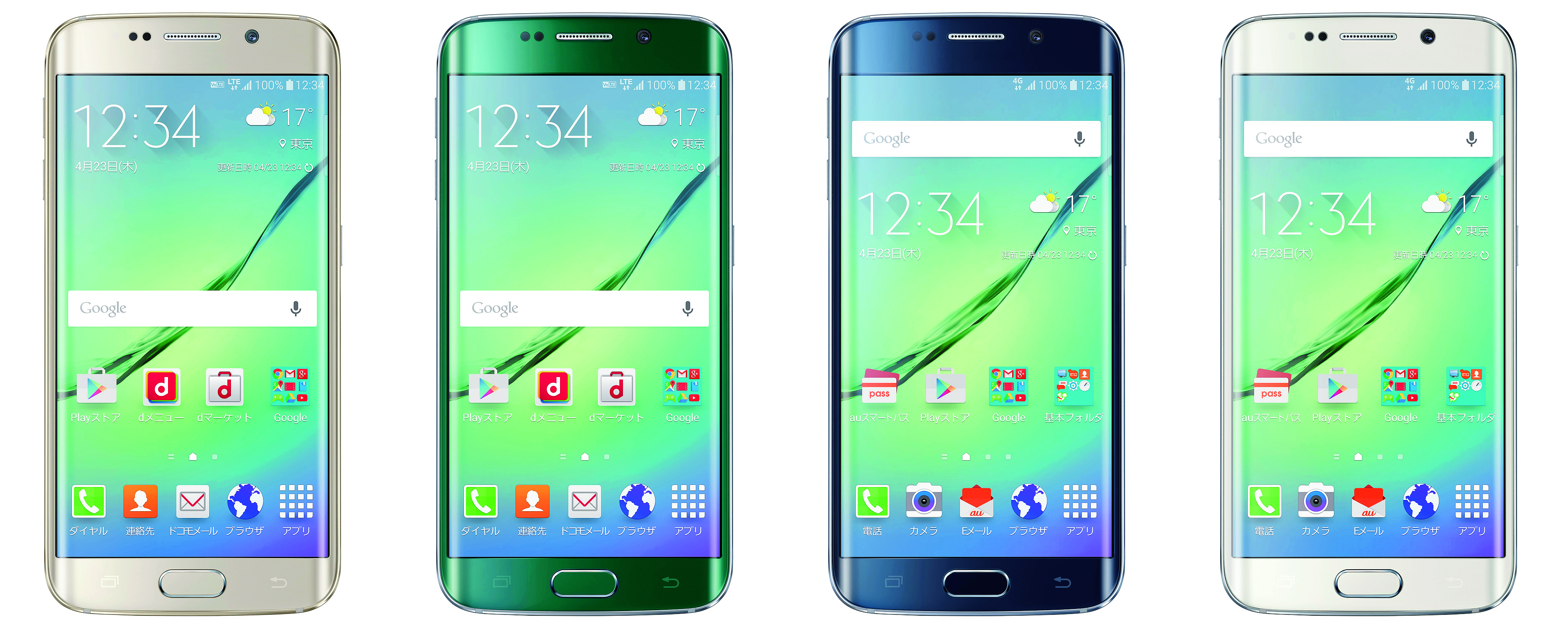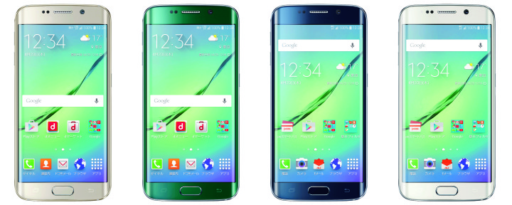 細かな文字もしっかりと判読できる、約5.1インチのSuper AMOLEDディスプレイを搭載。端末のカラーは全4色で、Gold Platinum(左)はNTTドコモとauから、Green Emerald(左から2番目)はNTTドコモ、Black Sapphire(右から2番目)とWhite Pearl(右)はauから、それぞれ発売されている