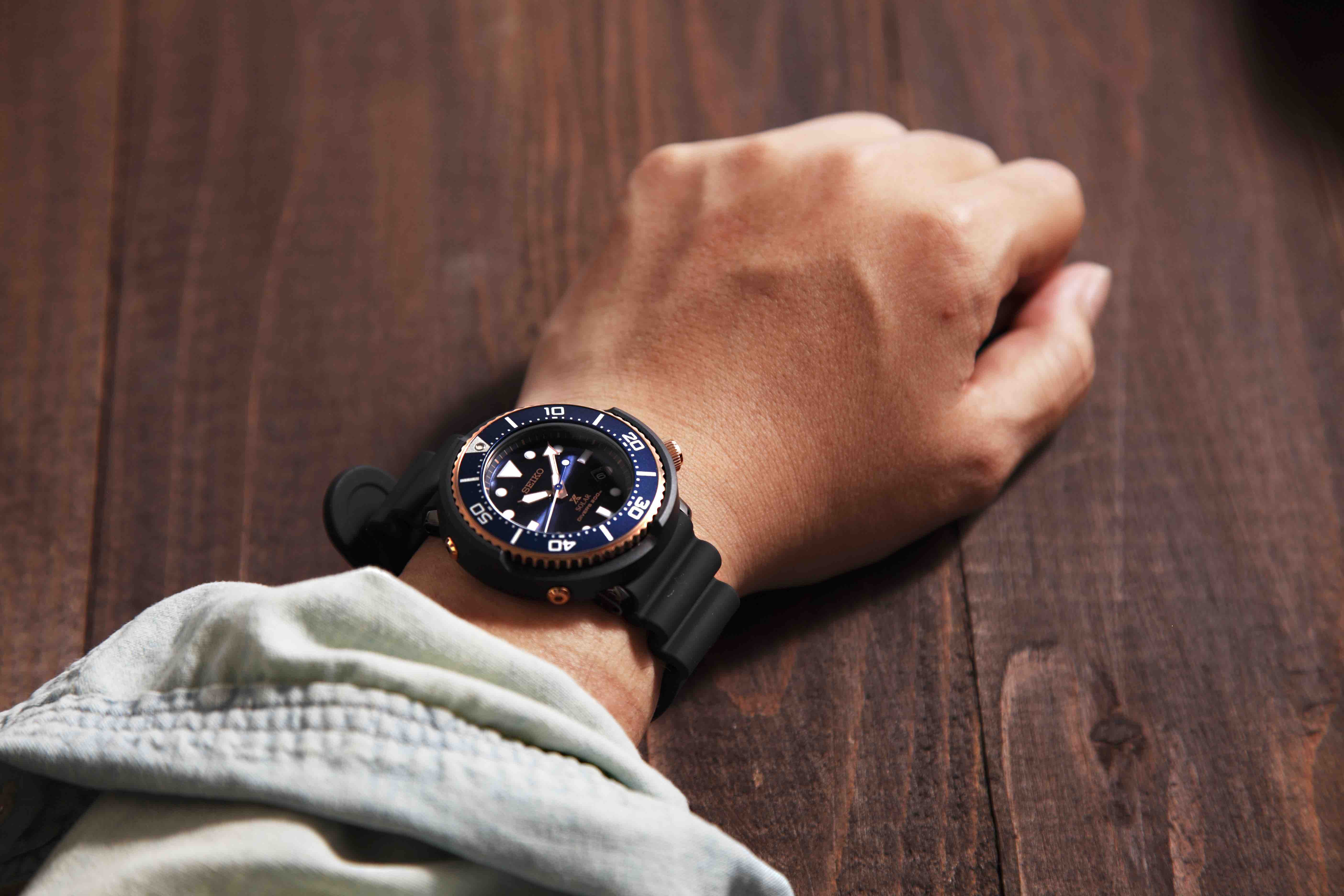 確かにこのファッション性の高さは、従来のダイバーズウオッチとは異なるイメージ。初めての人でも、普段使いに選びやすい。「とはいえ、そこはプロユースのセイコーダイバーズウォッチ。機能的にも一級品なので、実際のダイビングやアウトドアでも活躍します。どちらにも使えることが魅力ですね」