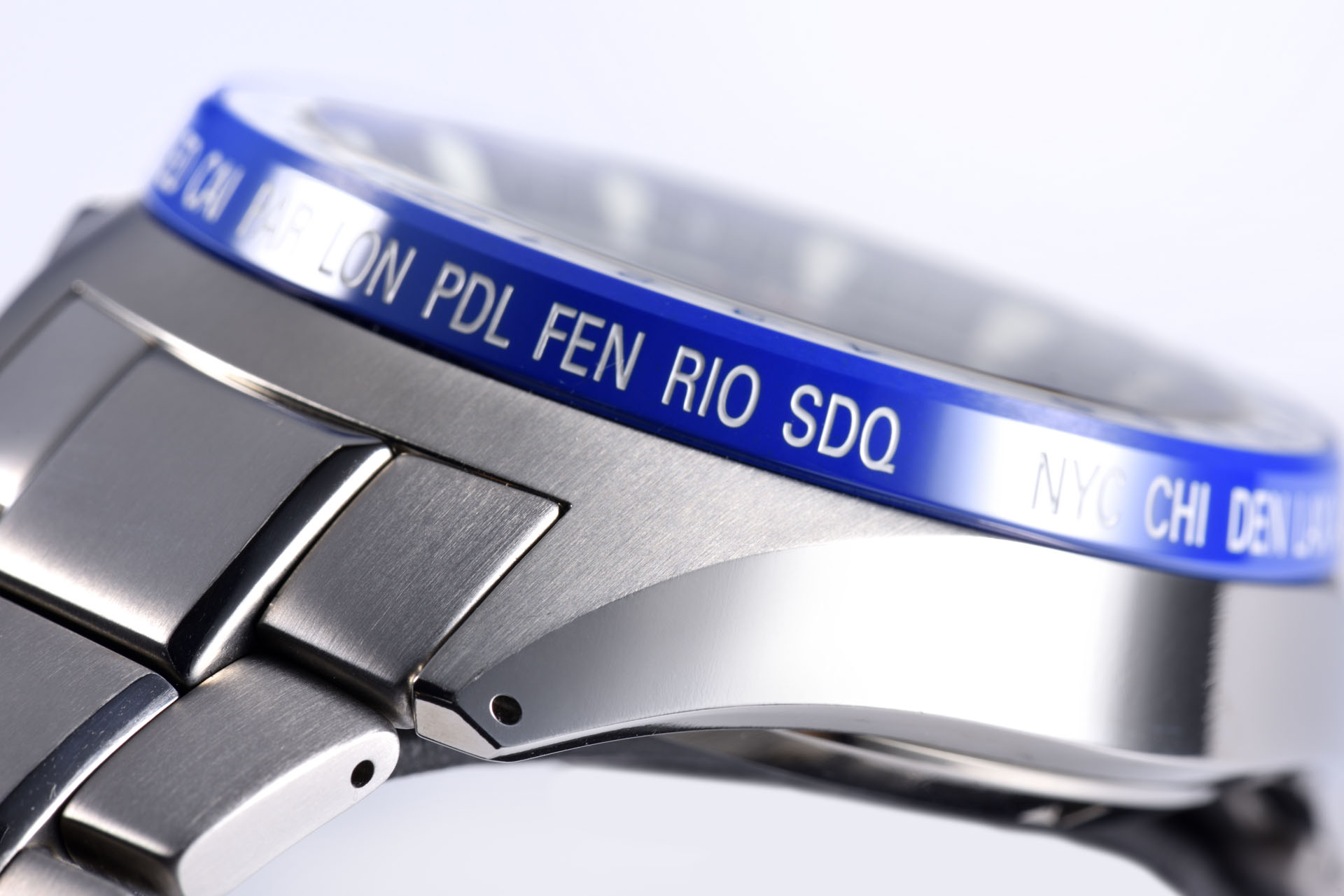 日中の太陽光の反射による見づらさを防ぐため、風防のサファイアガラスに反射を抑える「スーパークリア コーティング」を採用。一方、長時間発光する蓄光塗料をインデックスと針に施すことで、夜間の視認性も確保している。また、太く存在感のある時分針も判読のしやすさに貢献。タイムゾーンと都市名をダイヤルではなく、ベゼルに記したデザインも判読性を向上させている。