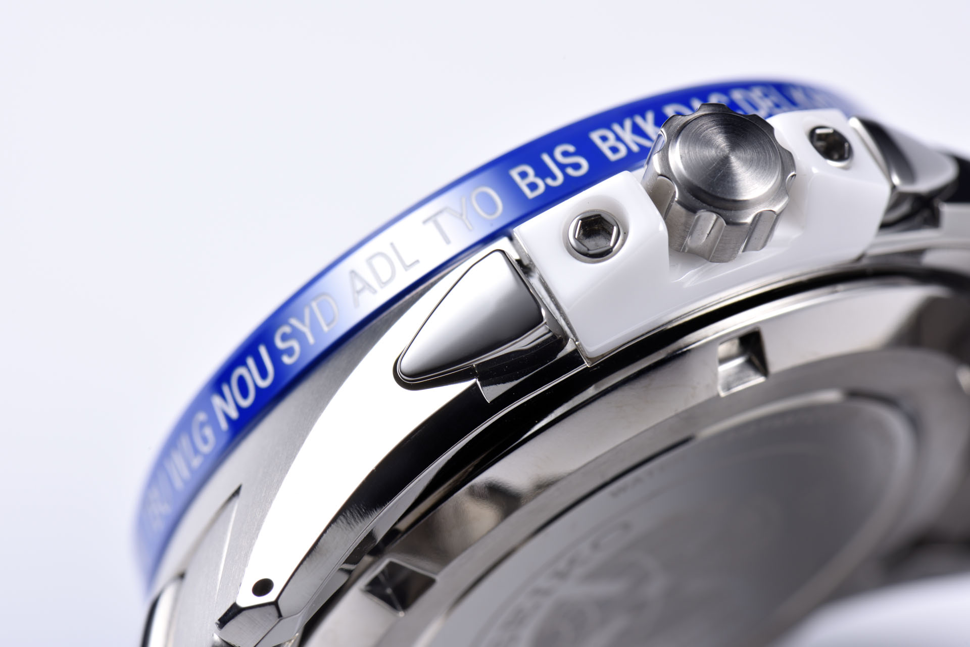 中でも特筆すべきなのが、GPSソーラー機能だ。南極周辺を航行する「ヴァンデ・グローブ」では、およそ3日に一度というペースでタイムゾーンを移動する。そのため、頻繁に手動で時計のタイムゾーンを切り替える必要があった。その点、オーシャンクルーザーは、GPS衛星からのシグナルを受信して、ワンプッシュで現在地の正確な時刻に修正することが可能なのだ。