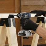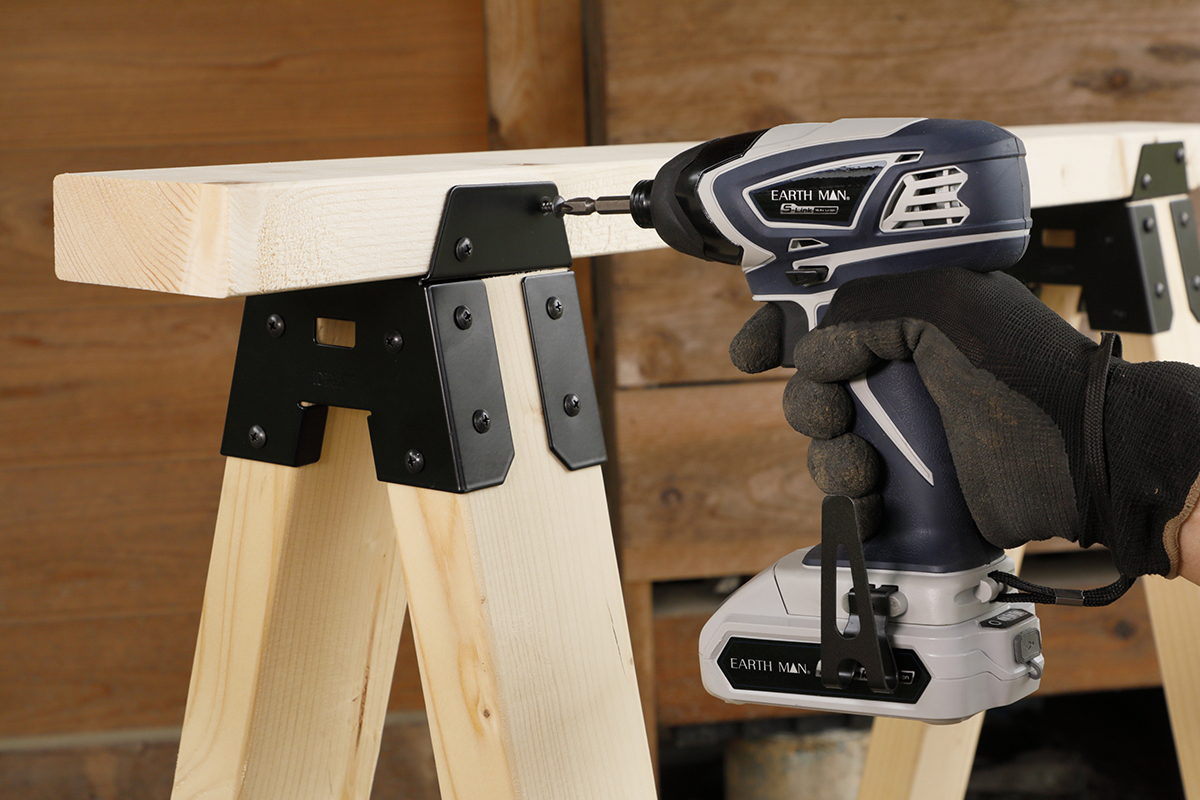 組み立ては簡単。ソーホースブラケットというパーツにビスで2×4材を固定するだけ。2×4材はホームセンターのカットサービスを利用すれば、自分で切る手間もありません。