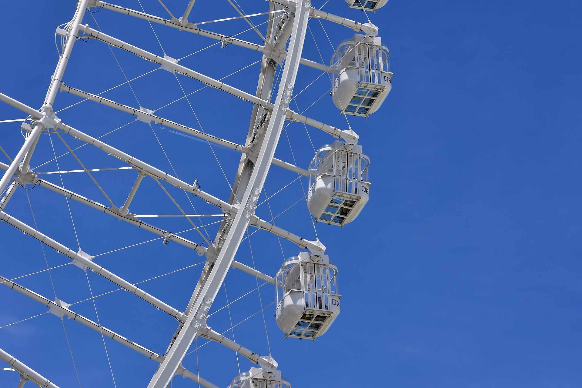 まずは日本一の高さを誇る大観覧車に乗ってみよう。日本一と言っても、東京の葛西臨海公園にある観覧車(117m)ではない。2016年7月1日に営業運転を開始したばかりの大阪・エキスポシティにある高さ123mの「レッドホースオオサカホイール」だ。
