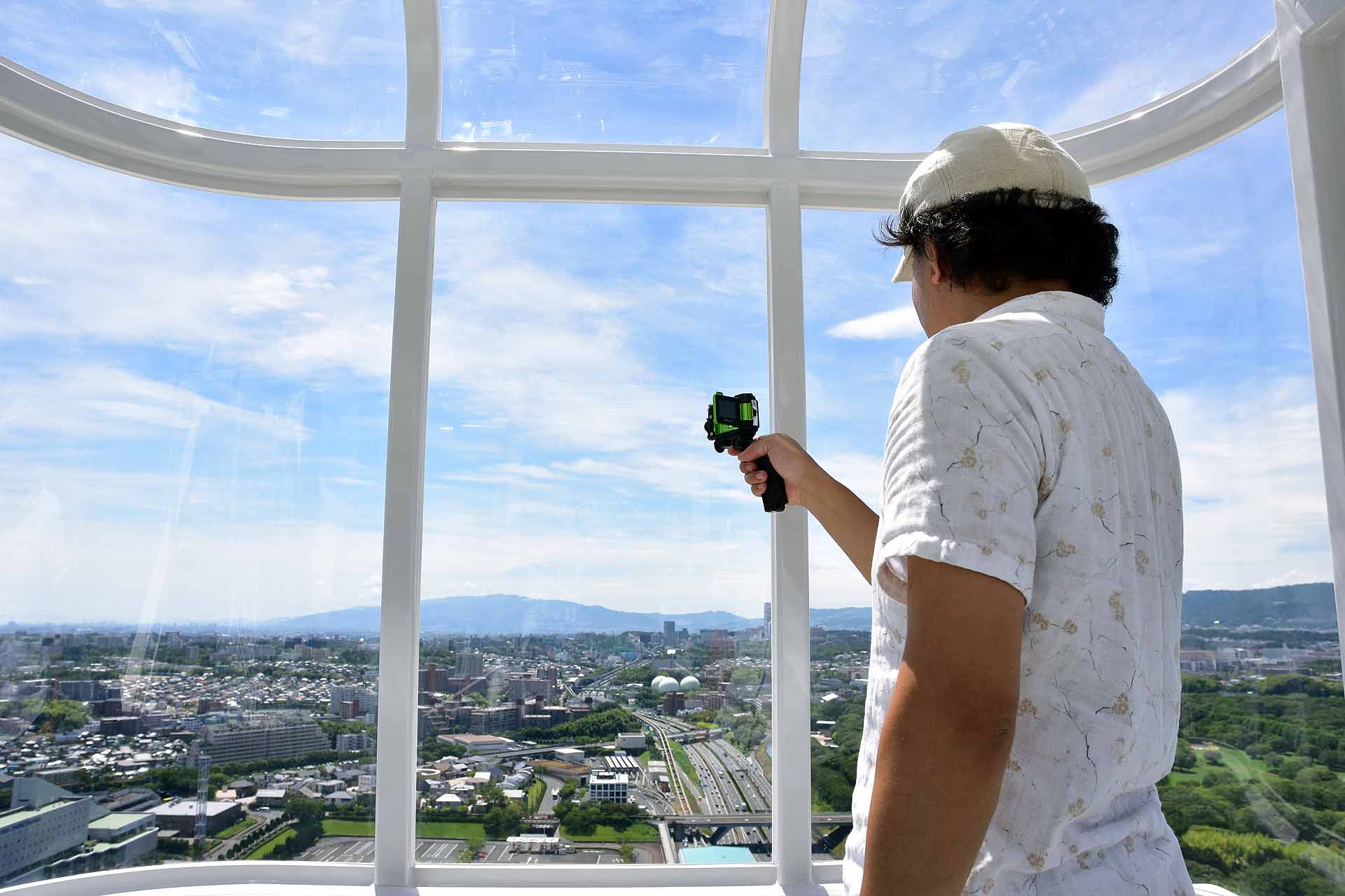 ゆっくりと上昇していくゴンドラの中で、TG-Trackerを使って周囲を撮影。一般的な観覧車では、撮りたい方向に支柱があるなど、思い通りに写真が撮れないが、オオサカホイールの場合は360度、撮りたい方角を自由に撮れるのが嬉しい。対角線画角204度という超広角レンズを活かした、大阪の大パノラマ映像が思う存分に撮影できる。