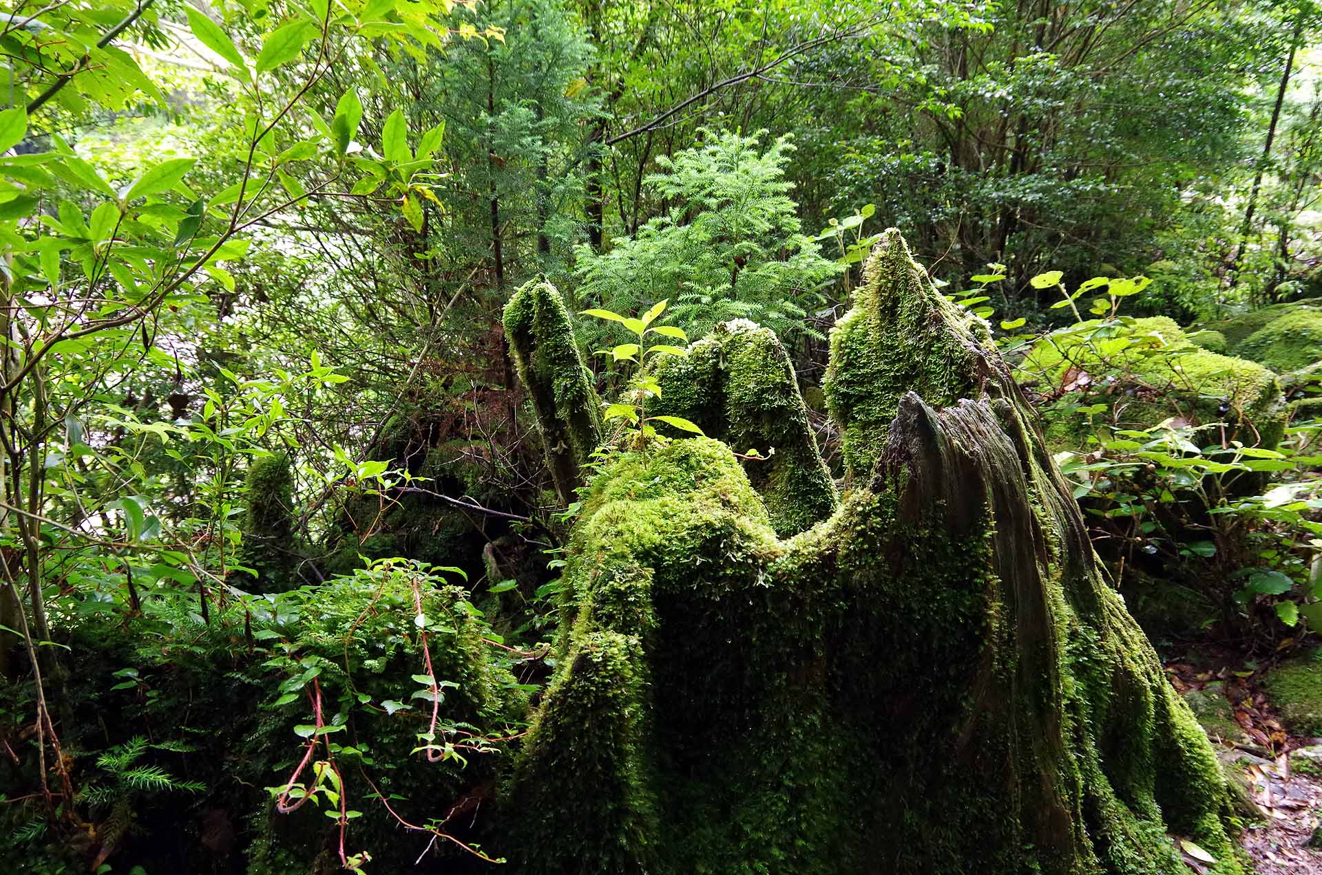 森の中を歩き続けていると、完全に非日常の別世界。巨大な木々がそこら中にあるため感覚が麻痺しそうだが、いずれも巨木と呼べる木々ばかりだ。苔にびっしりと覆われていることが、長く、豊かな歴史を実感させられる。シーンと静まり返った森では、鳥のさえずりと木々がゆらめく爽やかな音しか聴こえない。「ああ!来て良かった!」と誰もが感じるだろう。