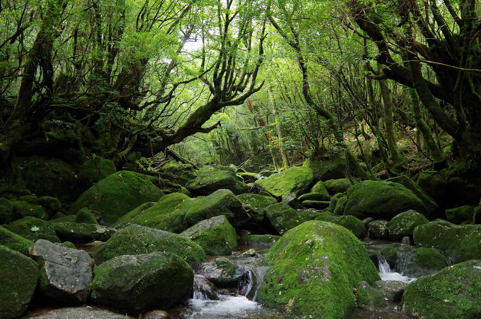 森の中に入ると、いわゆる屋久杉と呼ばれる巨樹だけでなく、太古から山を見守っているかのような苔むした木々がそびえ立つ。また風がゆらす葉の音や、川のせせらぎの音だけがあたりに響き、荘厳な空気が流れている。
