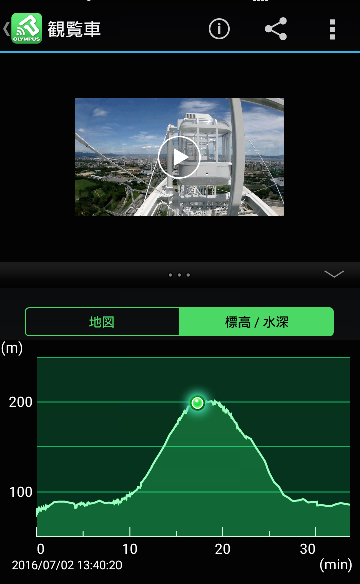 カメラ本体に搭載された気圧センサーが、標高ログ情報を取得。専用のスマホアプリ「OLYMPUS Image Track」を使えば、映像とログを同時に表示できる。ゴンドラがあがっていくに従い、高度がぐんぐんと上昇していくのがグラフ化されるのが楽しい