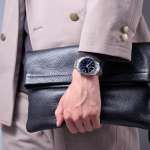 たとえば、セットアップスーツを使った軽快なビジネスカジュアル。グレージュのセットアップとグレーのニットがダークネイビーのダイヤルとエレガントな調和を生み出しながら、着こなしにスポーティなアクセントを添えている。