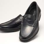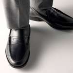 幅広いコーディネートに合うコインローファー。シャープな顔つきでスーツとの相性も抜群。ブラックとバーガンディの他、落ち着いた色味のネイビーも展開