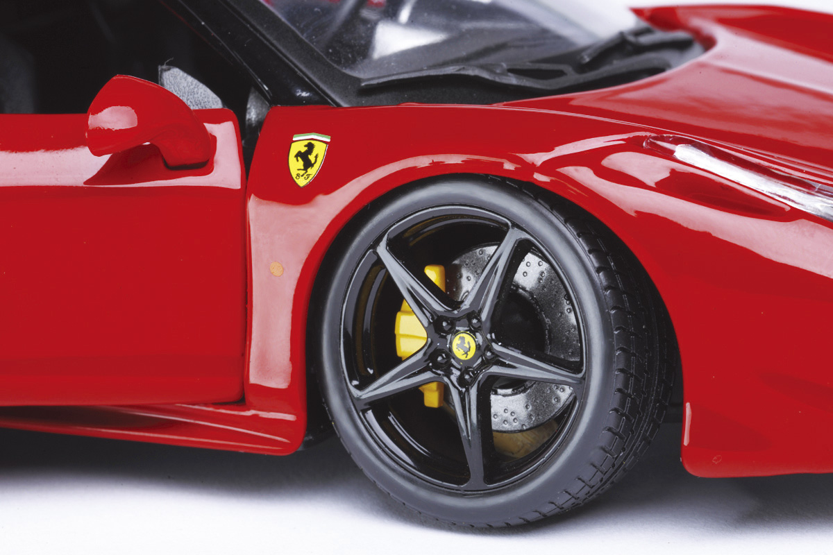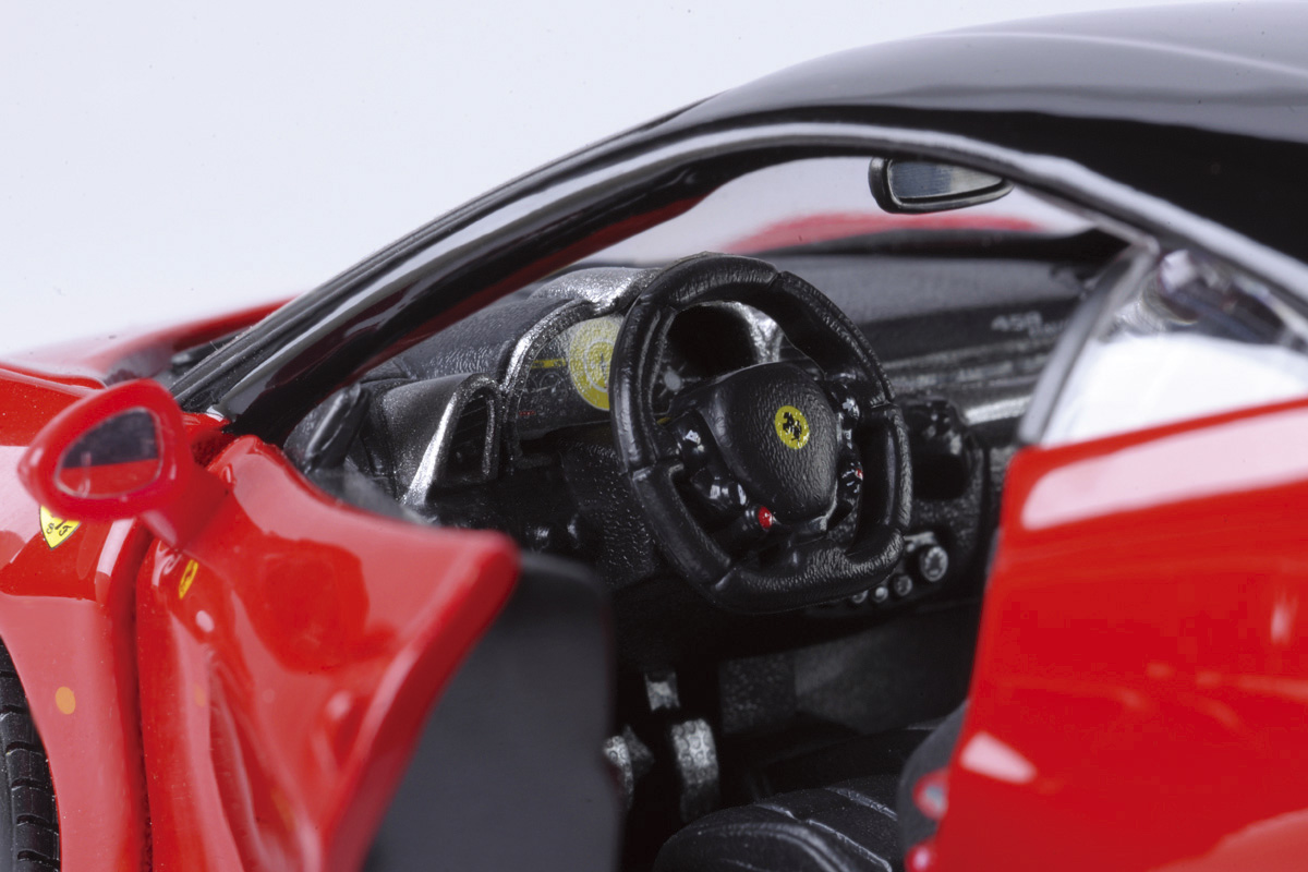 また、何より1/24スケールのメリットを感じるのは、ドアやエンジンフードといった開閉アクションを無理なく盛り込むことができたこと。これにより、フェラーリの魂であるエンジン、心たかぶるコクピットなど、精密に再現されたディテールをじっくりと鑑賞することが可能となっている(一部、ドアやエンジンフードが開閉しないモデルもあります)。