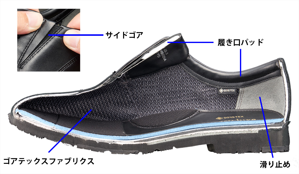 まず、屈曲性が高く、滑りにくいアウターソール。次に、土踏まずをサポートし、クッション性に優れたインナーソール。そして、足当たりを考慮した履き口パッドや、脱ぎ履きをスムーズにするサイドゴアなどのディテール。これらの要素によって、スニーカーのように歩きやすく、快適な履き心地を実現。