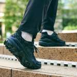 履き口からソールに至るまですべて黒で統一したシューズは、一見してアクティブなモノとは思えない佇まいに仕上がっている。当然、ビジネスカジュアルとも好相性だ。