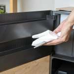 充電はもちろん、ゴミの回収や水拭き用の給水まで対応したクリーンベース。ゴミの格納は最大1年分、さらに約30日分に相当する給水タンクを備える。ゴミを吸い取る際の音が従来のクリーンベースから大幅に軽減されたことも特徴。天板にはウッド調のパネルが備わり、小物を置くスペースとして活用することが可能だ。
