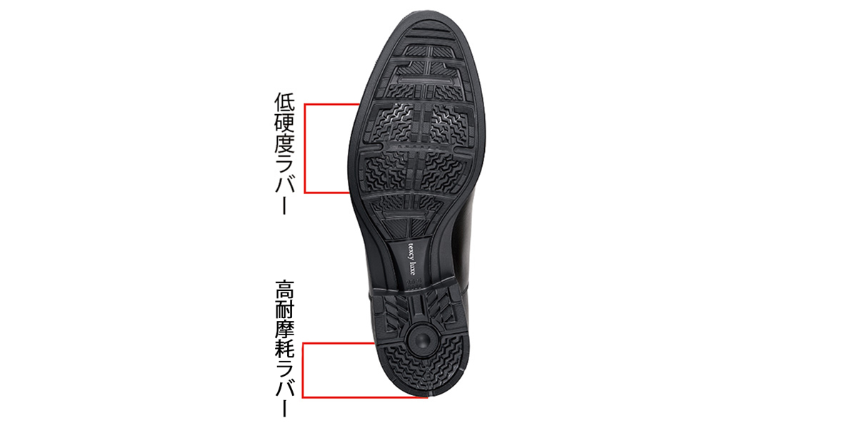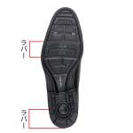 ▲すり減りやすい踏みつけ部とかかと部に高耐摩耗ラバーを採用。ラバー部分にはレーシングカーのタイヤを参考に細かな溝を多数配置
