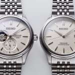 ▲右:セイコー プレザージュ クラシックシリーズ 「SARX121」(13万2000円) ケースサイズ 40.2mm、厚さ13mm、キャリバー6R55、メカニカル 自動巻(手巻つき)、日差+25秒〜−15秒、ステンレスケース、日常生活用強化防水(10気圧防水)、パワーリザーブ約72時間(最大巻上時)、秒針停止機能、ワンプッシュ両開き方式/左:セイコー プレザージュ クラシックシリーズ 「SARJ007」(15万4000円) ケースサイズ 40.2mm、厚さ13mm、キャリバー6R5J、メカニカル 自動巻(手巻つき)、日差+25秒〜−15秒、ステンレスケース、日常生活用強化防水(10気圧防水)、パワーリザーブ約72時間(最大巻上時)、秒針停止機能、ワンプッシュ両開き方式、24時針つき