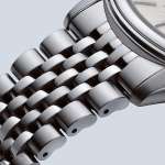 ケースは、ヘアライン仕上げと鏡面仕上げを細部にわたり使い分けることで、シンプルさの中にメリハリと奥行きを生み出している。