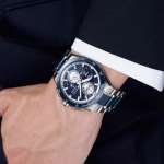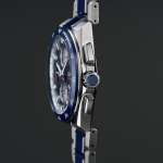 ダイヤルはブルー地のストライプに、ホワイトシルバーのサブダイヤルを重ねてコントラストを効かせることで視認性を高め、スポーティな印象に仕上げている。