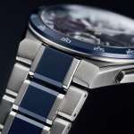 ブルーセラミックスならではの発色と、仕上げ分けされた純チタンの輝きが調和し、上品さと精悍さをあわせ持つ端正な佇まいに。