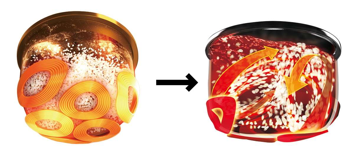 6つの底IHヒーターで縦横無尽に米を舞い上げる「3DローテーションIH構造」
