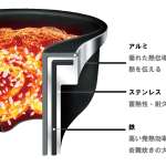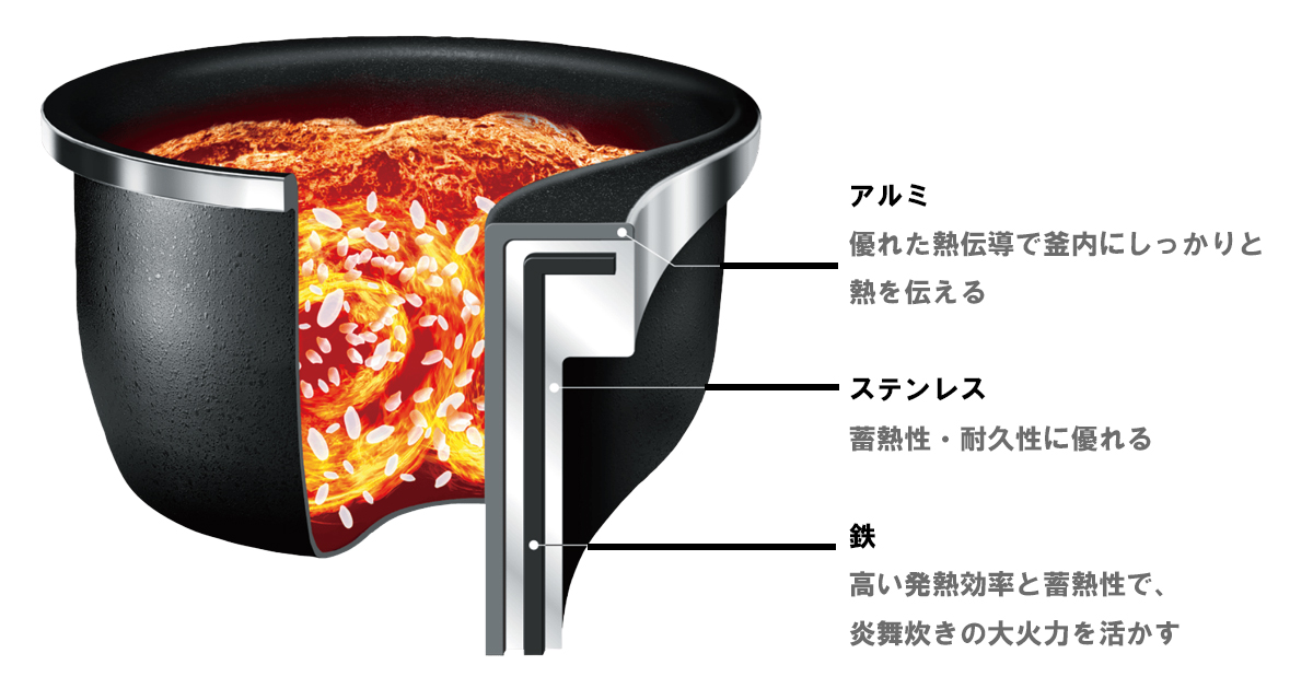 「IHと相性が良く発熱効率と蓄熱性が高い“鉄”を、熱伝導率の高いアルミと耐久性に優れたステンレスに組み込むという独自構造がポイント。素材それぞれのいいとこどりをして、お米をふっくら美味しく炊き上げます!」(コヤマ)
