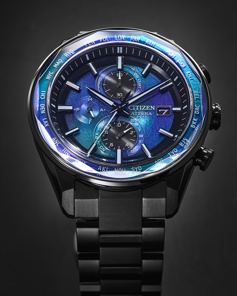 さらに、加工の難しいサファイアガラスに繊細なカッティングを施すことで、光の陰影が幾重にも広がり、独特な趣をもたらしている。これは、シチズンの技術力があるからこそ実現できた、特別な仕上がりだ。