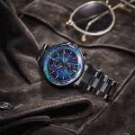 高い実用性に加えて、光の加減でブルーからパープル、時に深いグリーンへと変化する文字板は、目に映るたびに気持ちを弾ませてくれる。