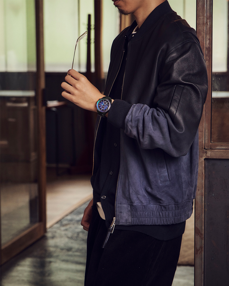構造色とは、塗料ではなく物質の微細な構造によって光を干渉させ、角度や光源によって色が変化して見える現象のこと。ゆえに、従来の文字板では得られなかった独特の彩りが腕元に宿るのだ。