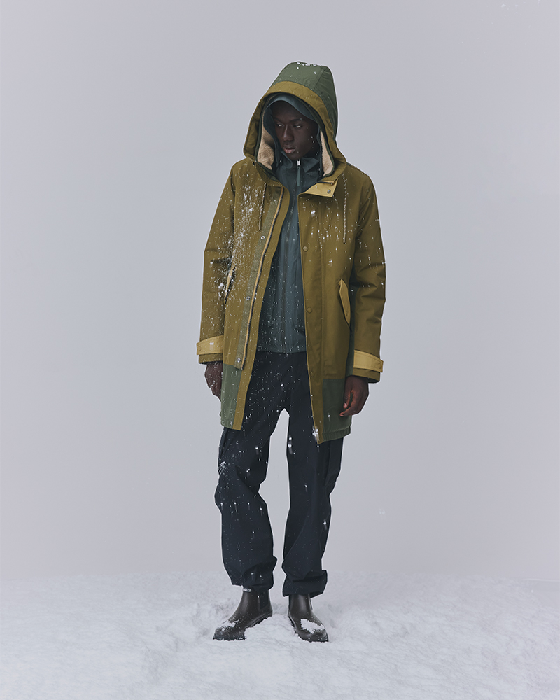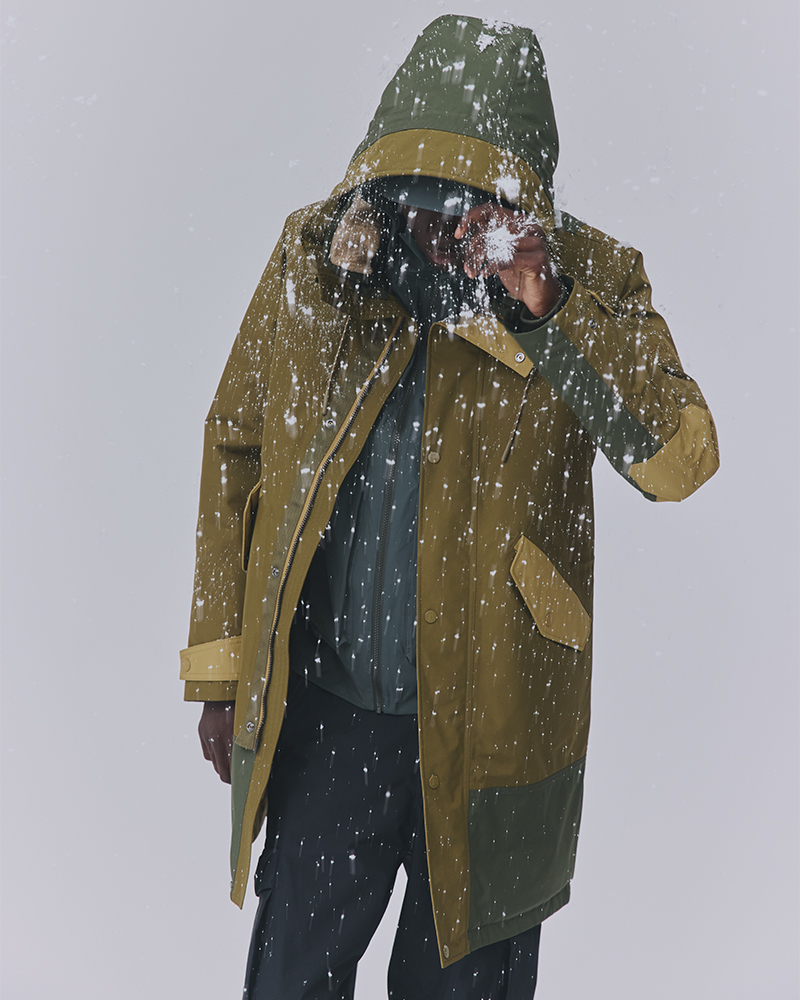 象徴的なフィッシュテールパーカーをベースにしたゴアテックスアウターは、防風・防水性と透湿性を兼ね備えた高機能モデル。フェイクシープスキンのフードライニングやV字型キルティング、カラーブロックの切り替えなど、細部にまでこだわりが光る。