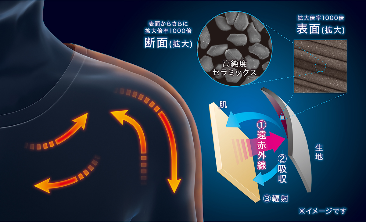 「簡単に言えば、睡眠時に身体から放出される遠赤外線をウエアの繊維に練り込まれた高純度の鉱石(セラミック)が吸収して熱に変換・再放射することで血行を促進するという仕組み。こうすることで疲労を緩和しやすい環境を整えています」