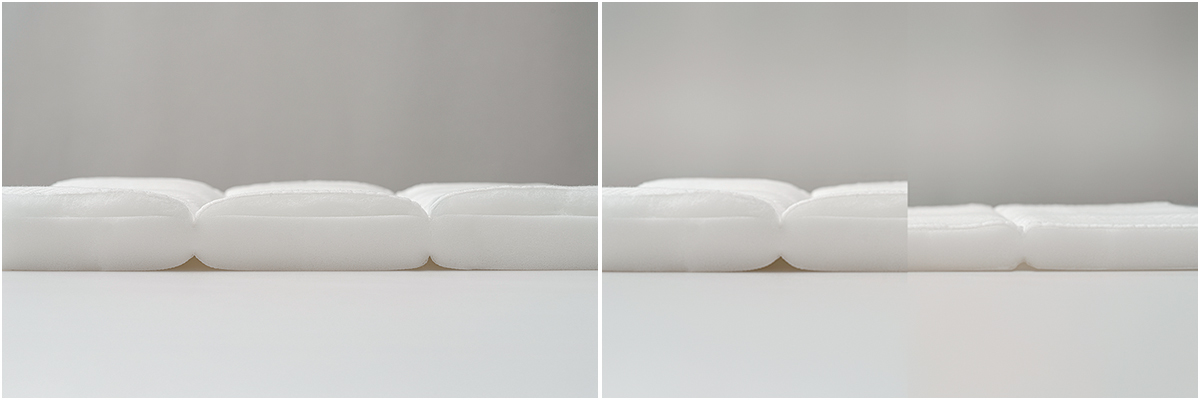 一般的なマットレスのフォーム厚は約2cmが主流だが、台湾の老舗メーカーと共同開発した高分子弾力ウレタンフォームは贅沢な6cm仕様。体圧を均一に分散しつつ反発力も維持することで底付き感のない快適さを実現。熱伝導性にも優れ、より快適な眠りが味わえる。