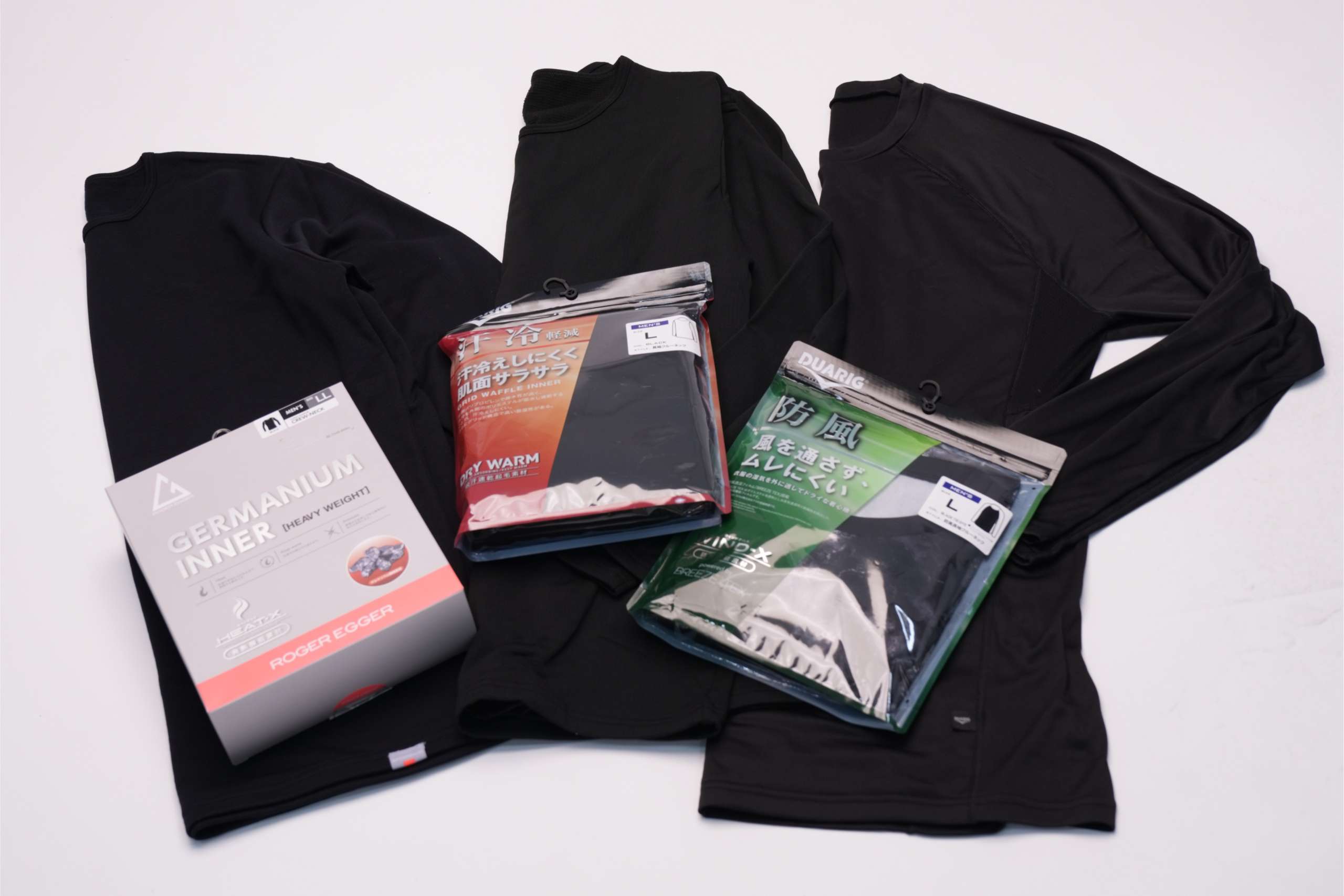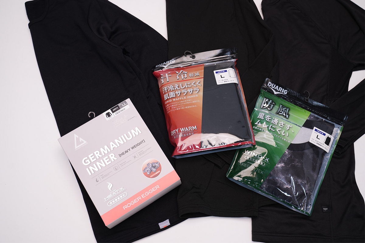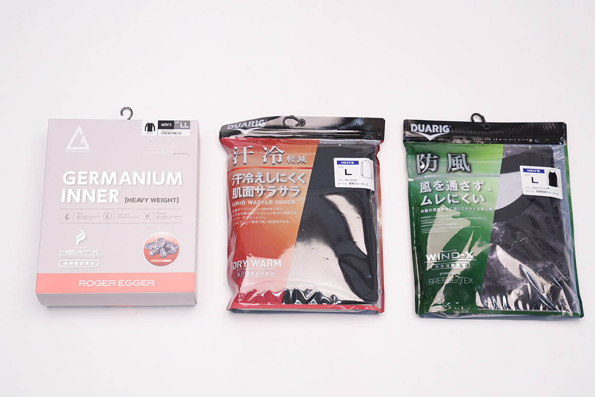 ▲左からROGER EGGER「HEAT-Xインナー」(3289円)DUARIG「DRY WARMインナー」(3289円)、DUARIG「WIND-Xインナー」(2189円)