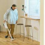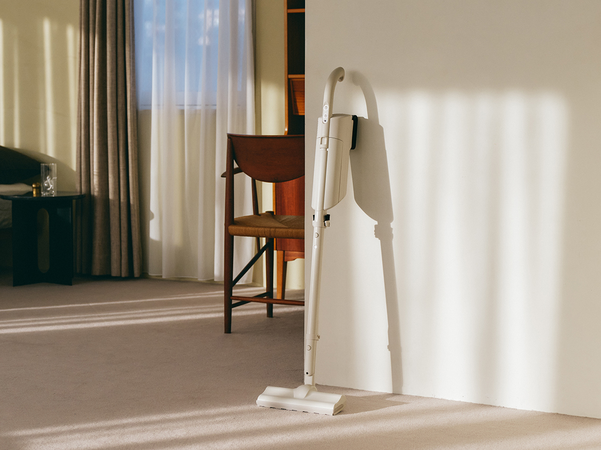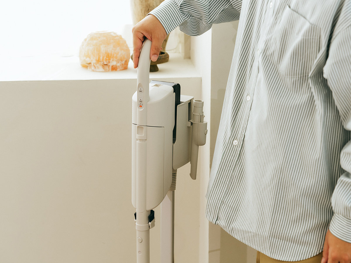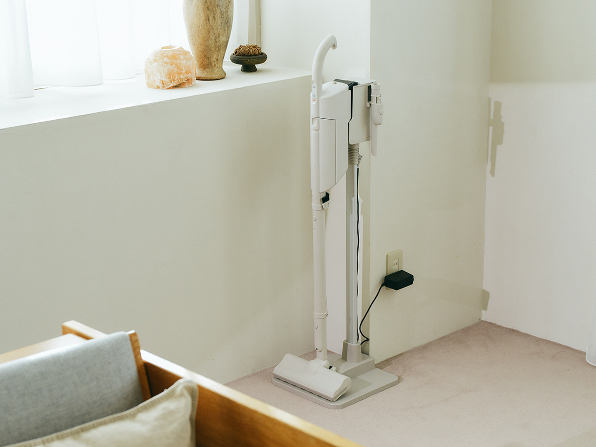 そしてサッと置くだけで充電できるラクラク仕様のスタンドも特筆すべき点。省スペースかつ洒落た色味のシフォンベージュがインテリアの邪魔にもなりません。編集部・山口も「場所も取らないし家具などのインテリアとマッチしやすいので、購入するときの家族会議もスムーズでした」と太鼓判。ちなみに、バッテリーの背面には「滑り止めゴム」が配されているため、掃除の途中に壁などに立てかけられるのもグッドポイント!